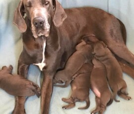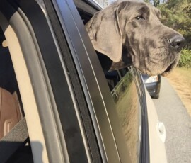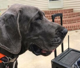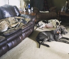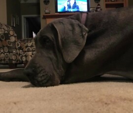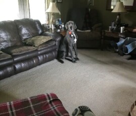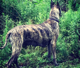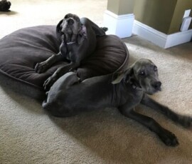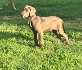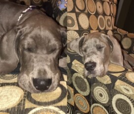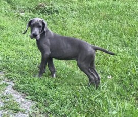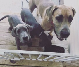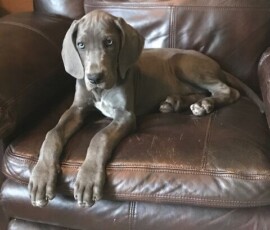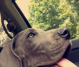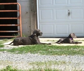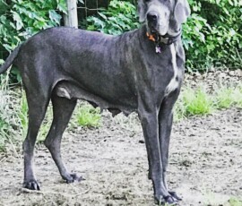 A beautiful blue with small amount of white on chest 50% american 50% euro Great Dane, that stands 33" at shoulders, and 135lbs. Attie is color pure blue. She produces blues and harls depending on who we pair her with. You don't want to miss out on one of her puppies she is the sweetest most quiet of all of our girls. She will sneak up behind you on the couch if you don't know it and snuggle in within seconds.