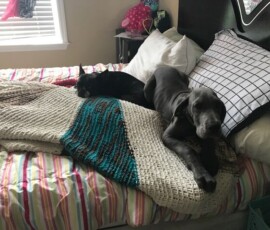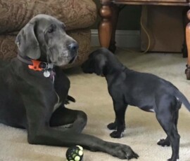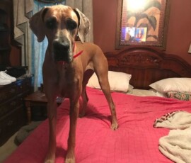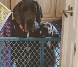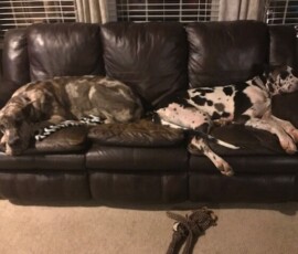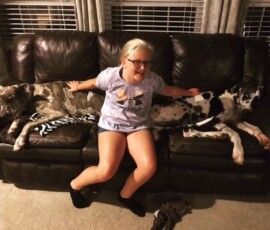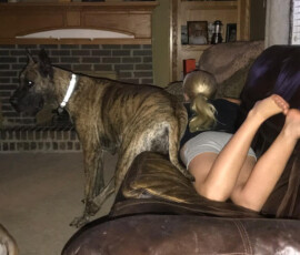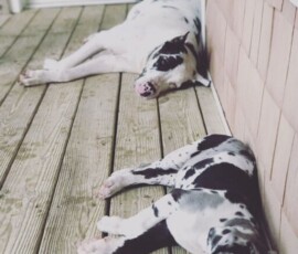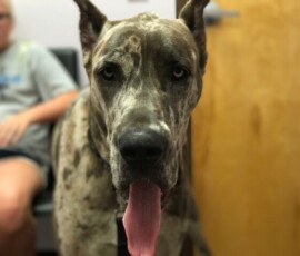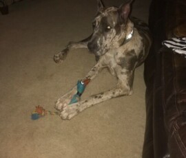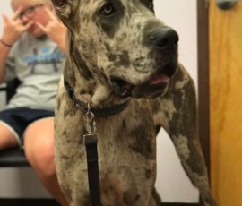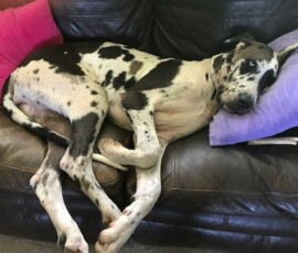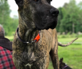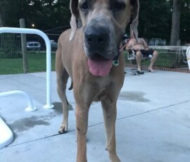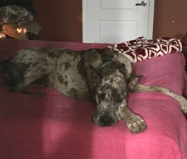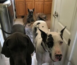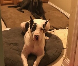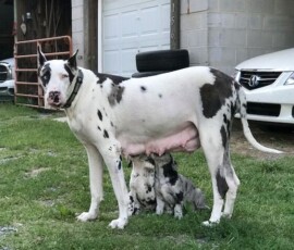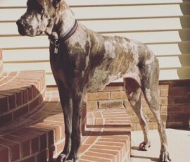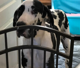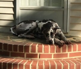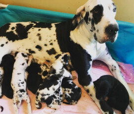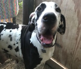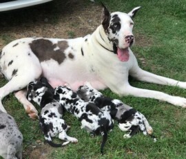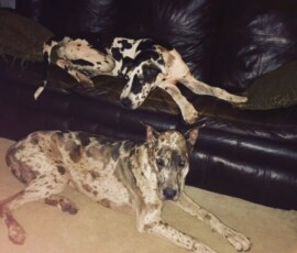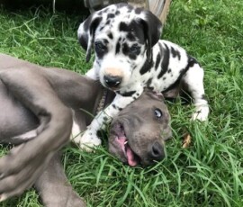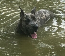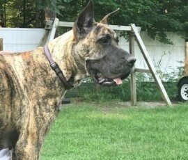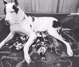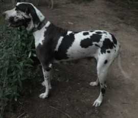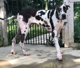 A beautiful harlequin Great Dane that stands 33" at shoulders, and 140lbs. She has blue and harlequin litters. Blue harlequins and fawnequins are in her future. She is very sweet and loves attention. She likes to be a shadow and calmly walk behind whoever is around. She is the type that loves our whole family the same. Snuggling or taking a walk on the property is all the same to her as long as she is close to us.
