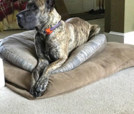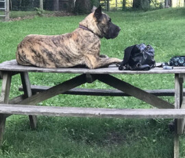 A beautiful fawn/brindle with black mask. She stands 36+" at shoulders, 165+ lbs. Molly is her Mommy's girl. She is 75% euro and it shows. Everything about Molly is perfect! As are all my girls she is loving, caring, laid back, ready to go, and everything in between. Whatever I, Shanna Garner, is doing that is what she wants to be doing. Molly never has puppies available by the time her litter is born. Her waiting lists are continuous. She is the envy of all danes and a very big girl!